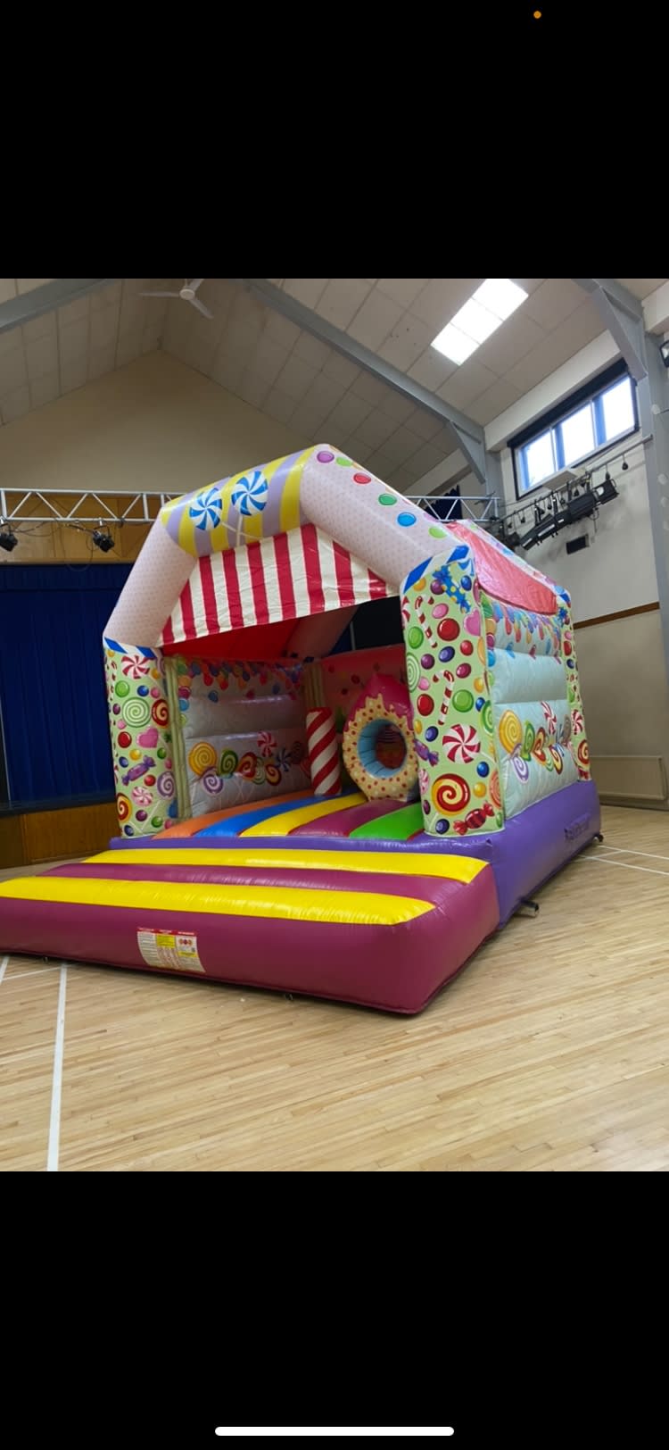 Sweet Castle. 5.3m x 4.6m x 4.5m. This size is ideal for big parties/events. Suitable for adults and children. This is our most popular castle for larger events.